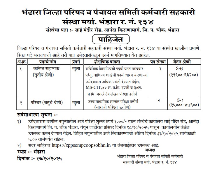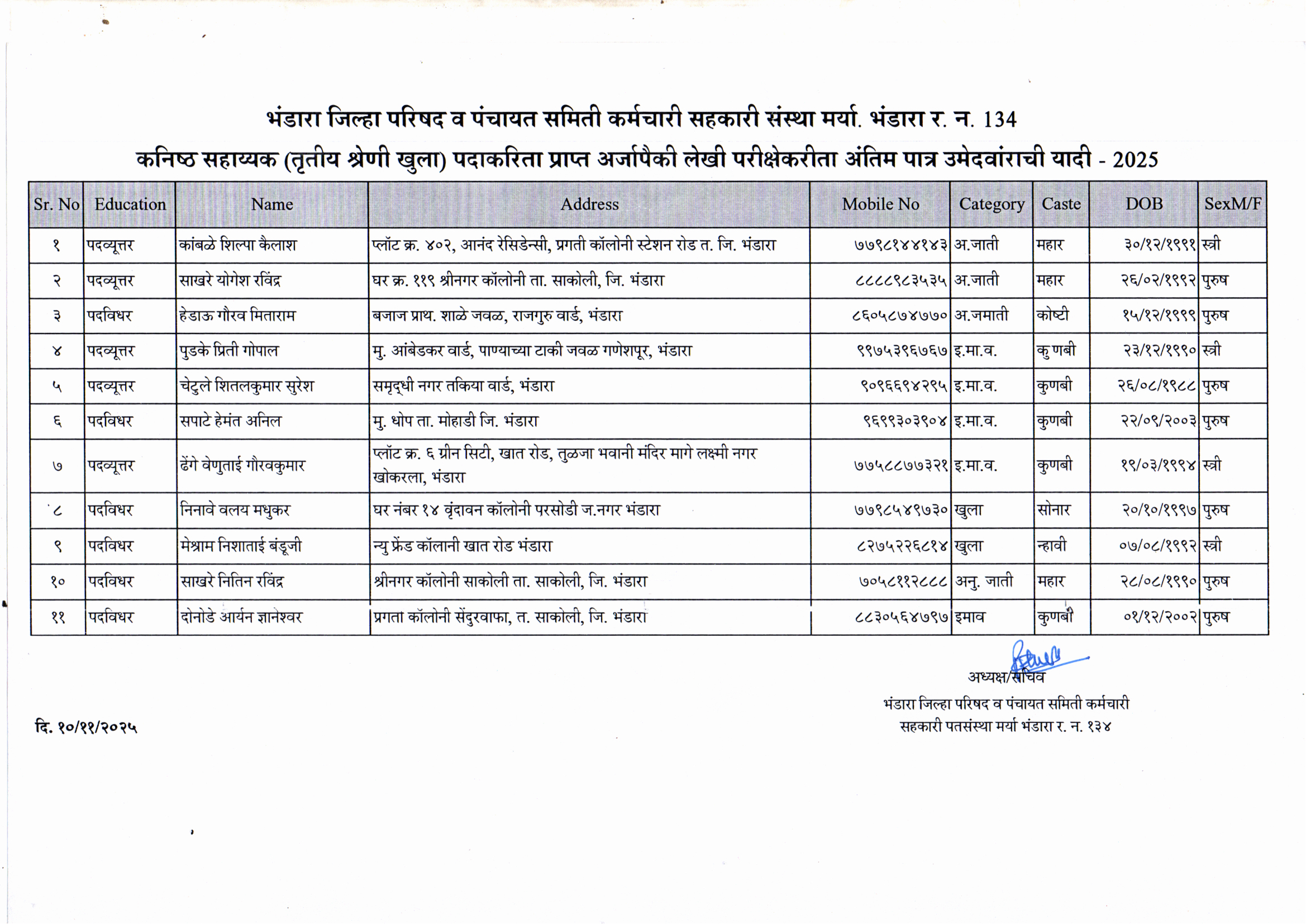 कनिष्ठ सहाय्यक (तृतीय श्रेणी खुला) पदाकरिता प्राप्त अर्जापैकी अंतिम पात्र उमेदवाराची यादी - 2025