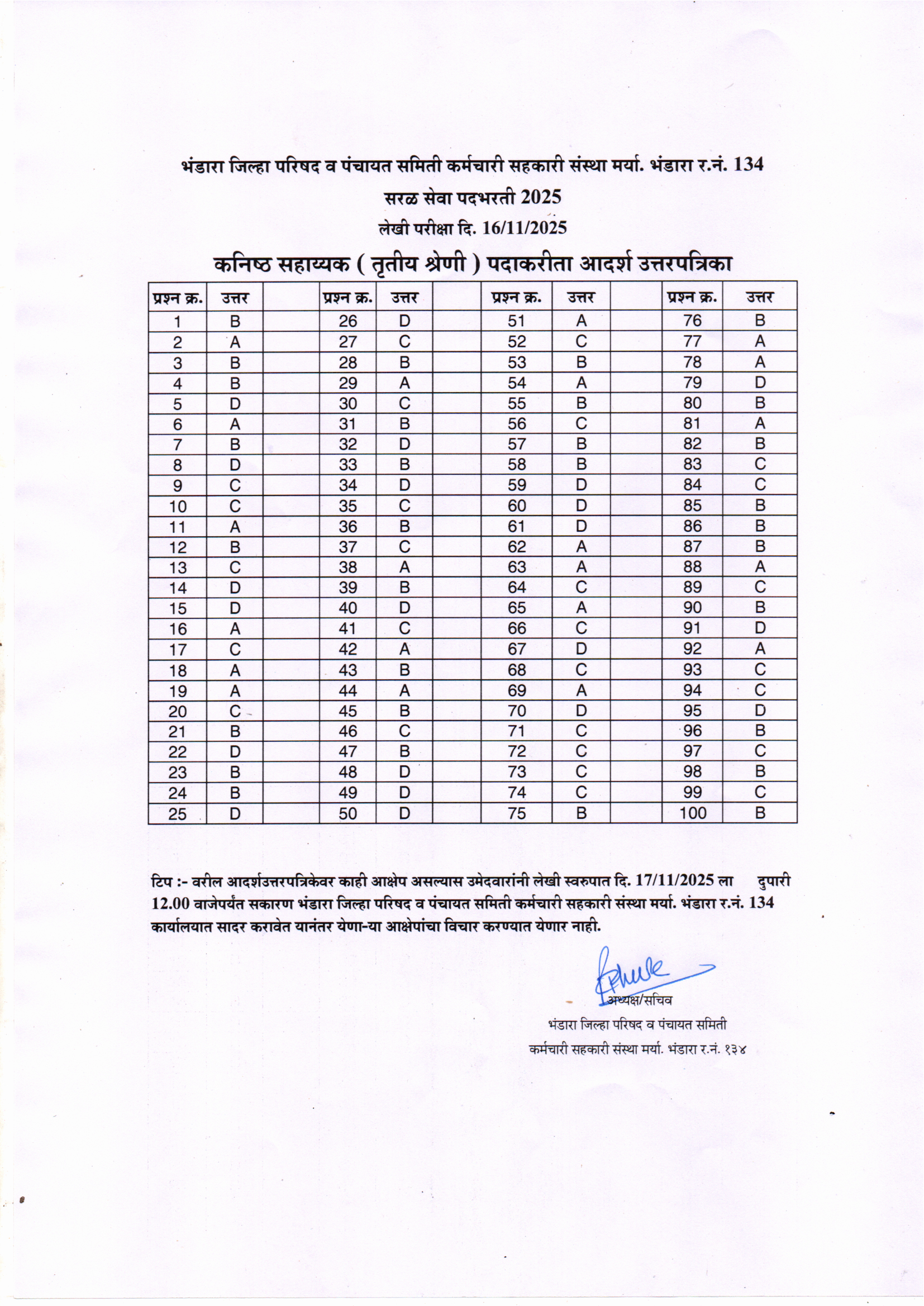 कनिष्ठ सहाय्यक (तृतीय श्रेणी खुला) आदर्श उत्तरपत्रिका
