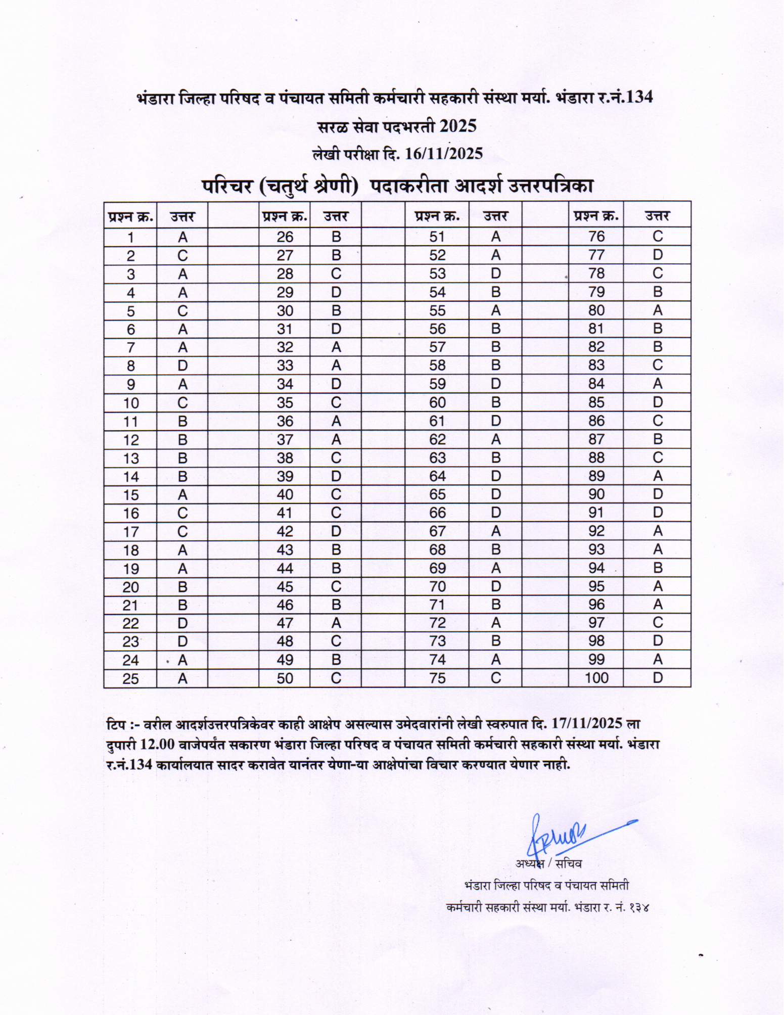 परिचर (चतुर्थ श्रेणी खुला) आदर्श उत्तरपत्रिका