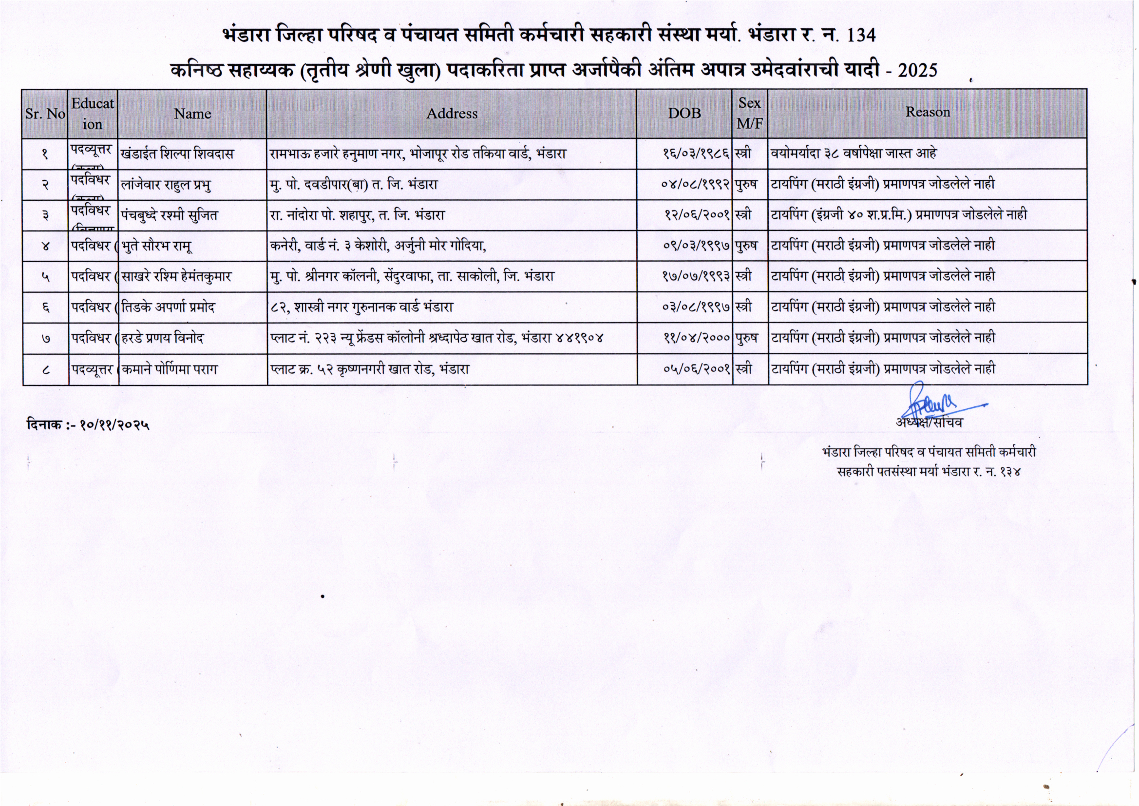 कनिष्ठ सहाय्यक (तृतीय श्रेणी खुला) पदाकरिता प्राप्त अर्जापैकी अंतिम अपात्र उमेदवाराची यादी - 2025
